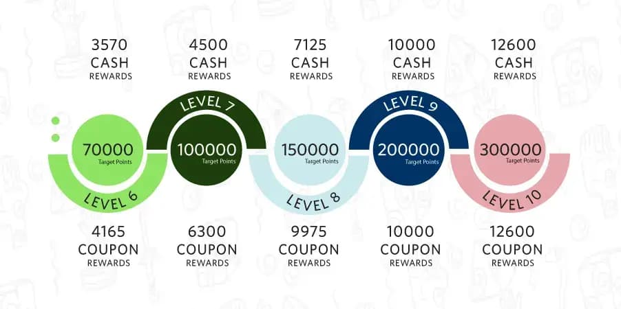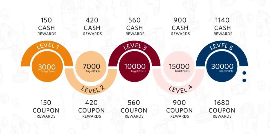 - Unlock each level and the system automatically redeem your points into Cash & Coupons. For example, when you reach the target point on the first level of 3000 points, the system will automatically process your benefits. Based on the Redeem details mentioned above, and you will be getting the Cash &Coupon benefits on your account upon unlocking each level.